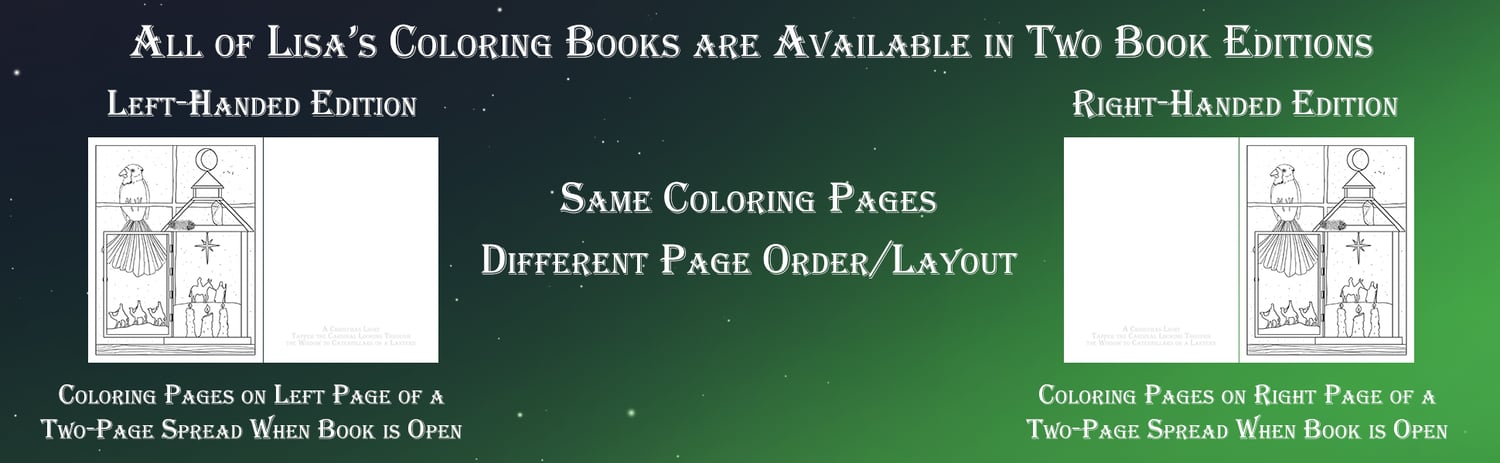 - A Left-handed Edition features the same coloring pages on the left page when the book is opened to two pages.